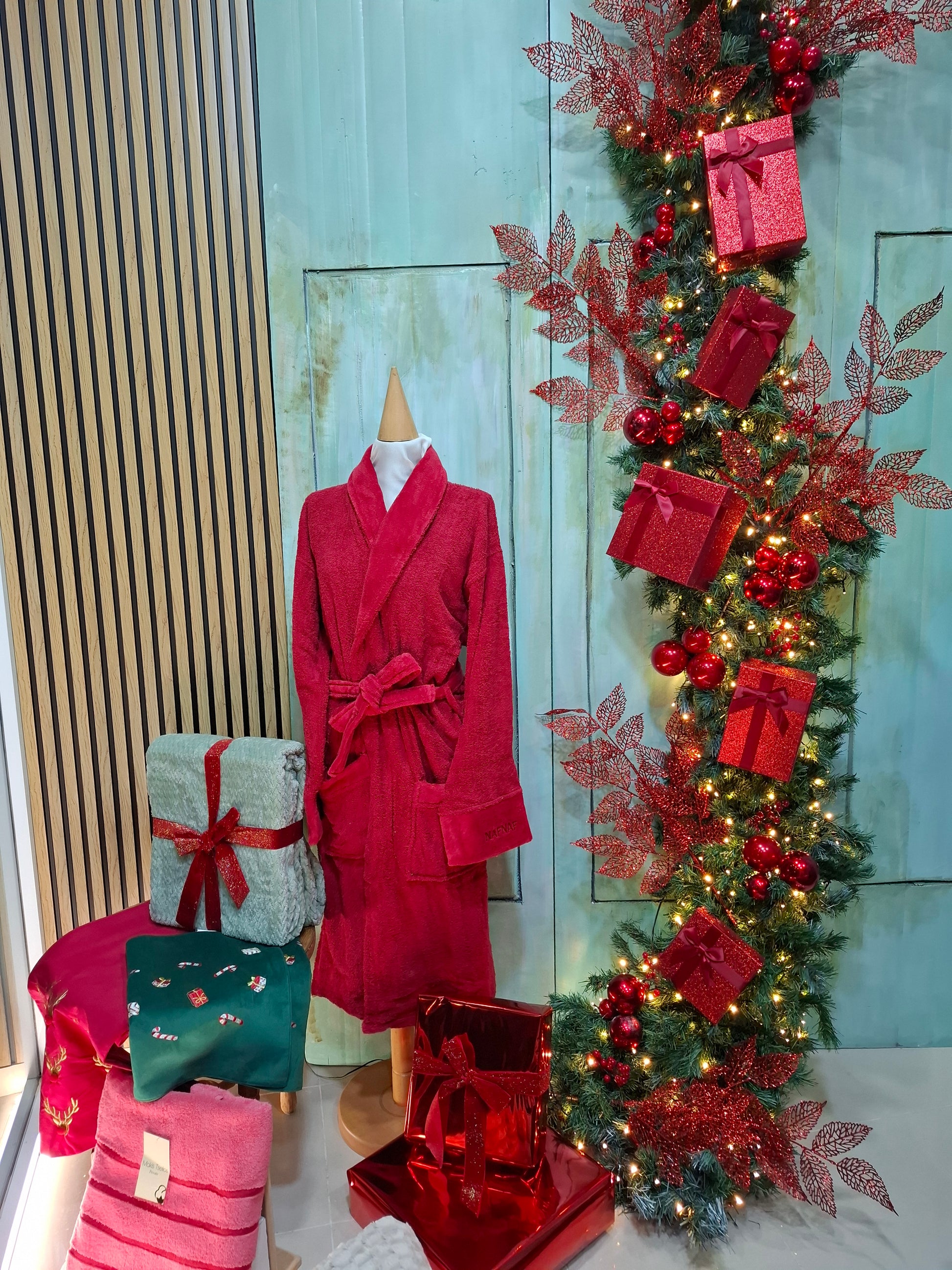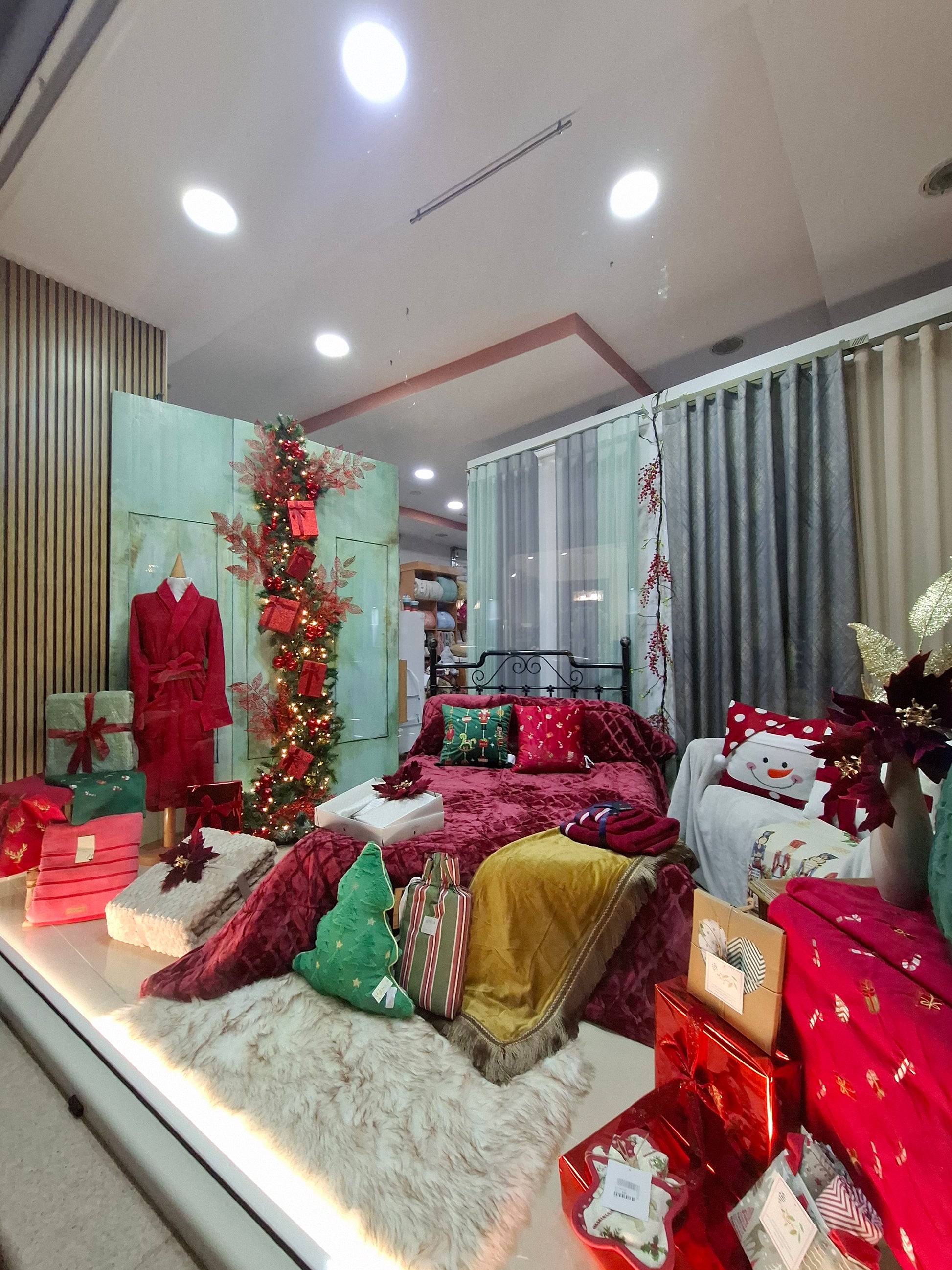Διακόσμηση χριστουγεννιάτικης βιτρτίνας σε κατάστημα με λευκά είδη
